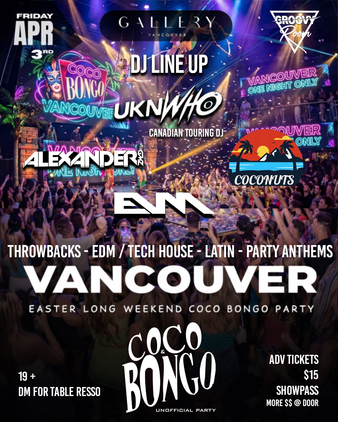 For one night only, Groovy Room brings the legendary Coco Bongo experience to Gallery Vancouver for a high-energy Easter Long Weekend celebration you will not forget.